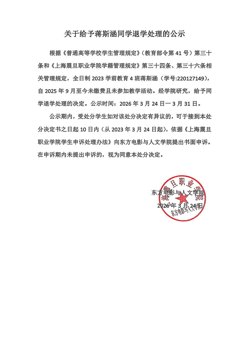 关于给予蒋斯涵同学退学处理的公示